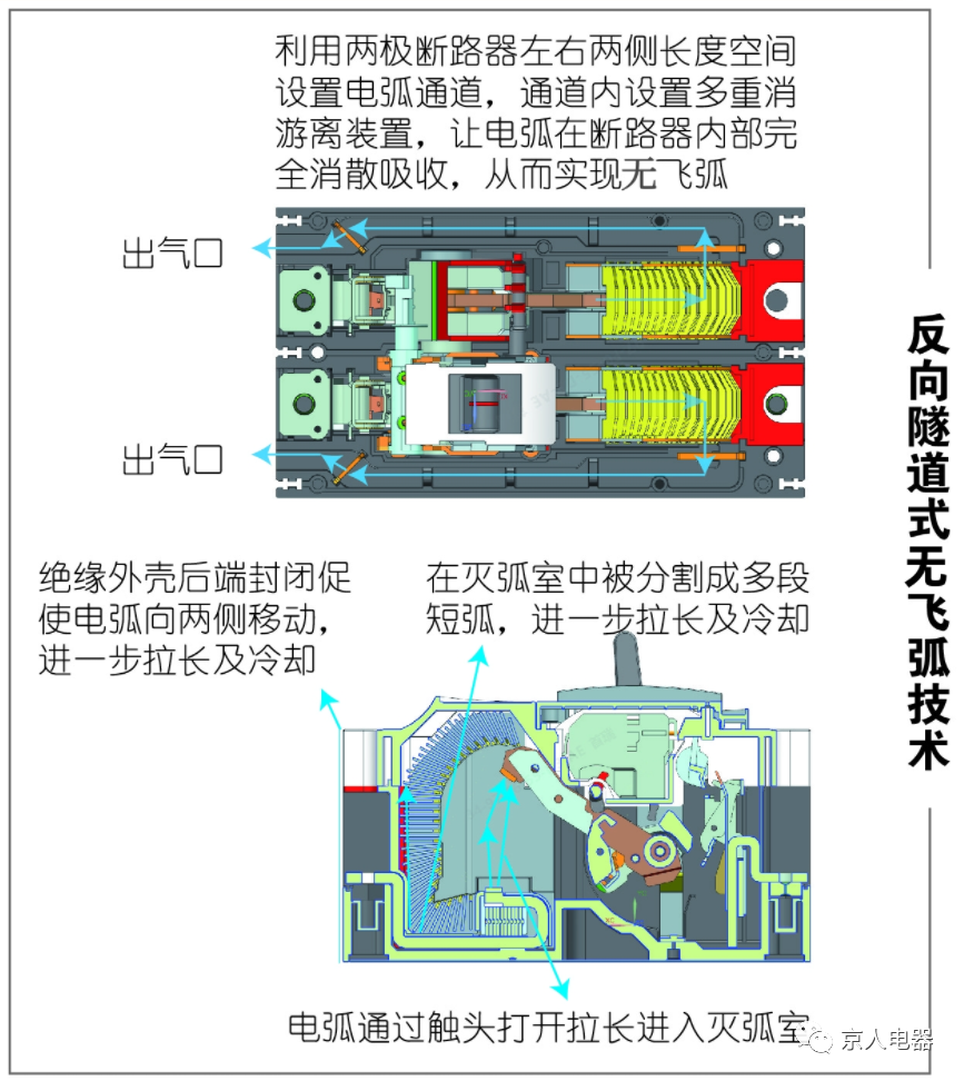 創(chuàng)新點(diǎn)3:C型滅弧室技術(shù),實(shí)現(xiàn)在同等體積下布置更多的滅弧柵片,快速熄滅電弧,提高滅弧性能。