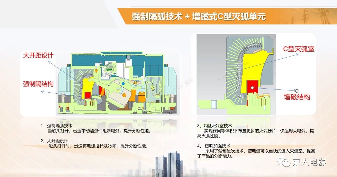 創(chuàng)新點(diǎn)1:強(qiáng)制隔離技術(shù),當(dāng)觸頭打開(kāi),迅速帶動(dòng)隔弧件阻斷電弧,提升分?jǐn)嗄芰Α?/strong>